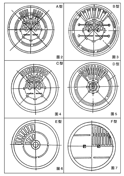 充氣箱在庫內(nèi)排列時,原則上要求實際排列面積占總面積的比例越大越好,攪拌庫和混合式均化庫中心區(qū)(攪拌區(qū)),對這點要求更為重要,現(xiàn)提供A、B、C、D、E、F六種基本排列形式供選用。
