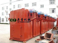 單機(jī)袋式除塵器具有設(shè)備體積小、處理風(fēng)量大、結(jié)構(gòu)緊湊使用方便等特點(diǎn)。該單機(jī)袋式除塵器具有不可替代的粉塵直接落入灰倉(cāng)或皮帶輸送設(shè)備的特點(diǎn),主要適用于庫(kù)頂、庫(kù)底、皮帶輸送轉(zhuǎn)運(yùn)點(diǎn)及其他局部塵源的收塵使用。含塵氣體由布袋除塵器入口進(jìn)入箱體,通過(guò)濾袋進(jìn)行過(guò)濾,粉塵被留在濾袋內(nèi)表面,凈化后的氣體通過(guò)濾袋進(jìn)入風(fēng)機(jī),由風(fēng)機(jī)吸入直接排入室內(nèi),亦可以接排風(fēng)管將為其排至室外。隨過(guò)濾時(shí)間的增加,濾袋內(nèi)表面粘附的粉塵也不斷增加,濾袋阻力隨之上升,從而需要清灰,清灰完畢后,除塵器又正常進(jìn)行工作。該除塵器采用自控清灰機(jī)構(gòu)進(jìn)行定時(shí)振打清灰或手控清灰機(jī)構(gòu)人工停機(jī)后自動(dòng)振打數(shù)十秒,使粘附在濾袋內(nèi)表面的粉塵抖落下來(lái)。粉塵落入灰斗、抽屜或直接落到生產(chǎn)設(shè)備中。