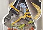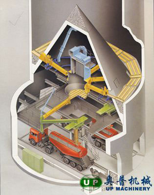 IBAU均化庫采用德國漢堡公司的連續(xù)均化技術。在外部帶一攪拌倉,IBAU均化庫庫底中心設一大圓錐,庫內生料的重量通過錐傳遞給庫壁,庫底環(huán)形空間被分成向中心傾斜10°的6個充氣區(qū),每區(qū)裝多種規(guī)格充氣箱。充氣卸料時生料被送至一條徑向布置的充氣箱上,再經(jīng)過錐體下部的出料口由空氣斜槽送入庫底中央攪拌倉中。卸料時,生料在自上而下的流動過程中,切割水平料層而產(chǎn)生重力混合作用,進入攪拌倉后又因連續(xù)充氣攪拌而得到進一步均化。均化值可達6-8,電耗0.1-0.2kwh/t生料。