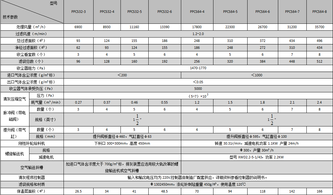·PPCS32型氣箱式脈沖袋收塵器技術(shù)參數(shù)表