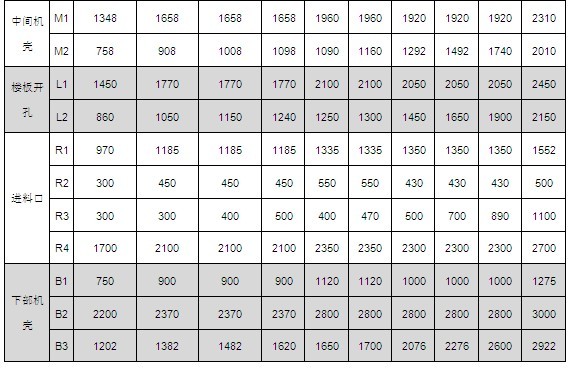 中部機殼--分為與上部裝置聯(lián)接的帶支撐中間節(jié)、帶檢視門中間節(jié)、標準中間節(jié)(均為 3.0米高)和非標準中間節(jié)。