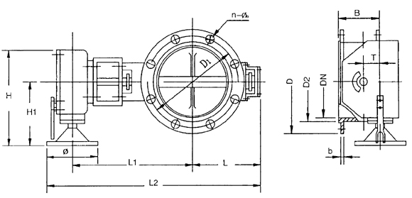DN | D | D1 | D2 | N-Φ。 | H | H1 | L | L1 | L2 | b | B | T | Φ |