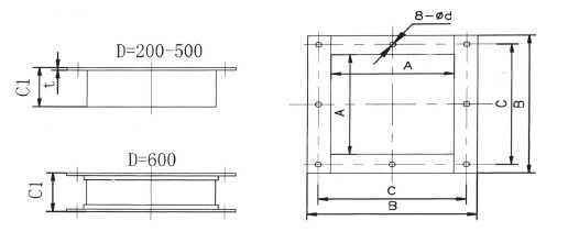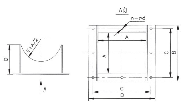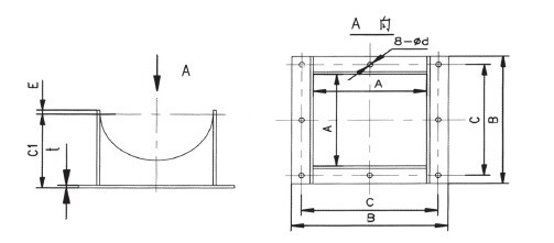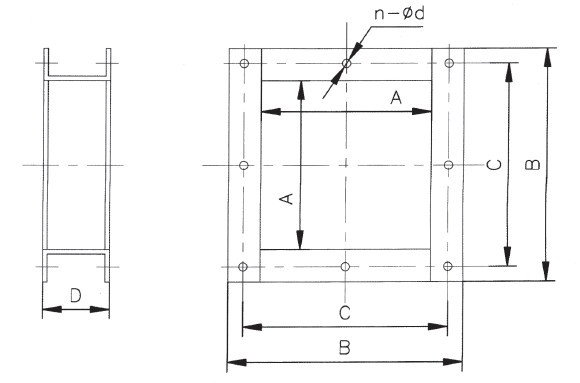 出料口的結(jié)構(gòu)表示如下圖,其系由鋼板折成的方形管及法蘭焊接而成,它不帶能關(guān)閉的出料口控制機(jī)構(gòu),在使用時將出料口焊于機(jī)殼上,其法蘭面與溜槽法蘭相聯(lián),裝配出料口的機(jī)殼還應(yīng)按出料口的內(nèi)孔尺寸開孔。