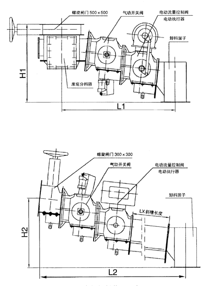 庫底卸料裝置由庫底螺旋閘門、庫底分料箱、電動(氣動)開關閥、電動流量控制閥及卸料溜子組成,用于水泥生料粉或水泥的庫底卸料。庫底卸料裝置能自動調節(jié)卸料流量且均勻,其結構合理,操作維護簡單方便,可設三個卸料口,用戶也可選用庫側卸料裝置。