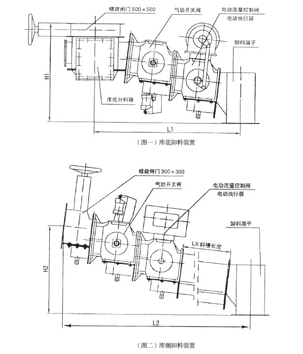 庫底卸料裝置由庫底螺旋閘門、庫底分料箱、電動(氣動)開關閥、電動流量控制閥及卸料溜子組成(見圖一),用于水泥生料粉或水泥的庫底卸料。庫底卸料裝置能自動調(diào)節(jié)卸料流量且均勻,其結(jié)構(gòu)合理,操作維護簡單方便,可設三個卸料口,用戶也可選用庫側(cè)卸料裝置(見圖二)。